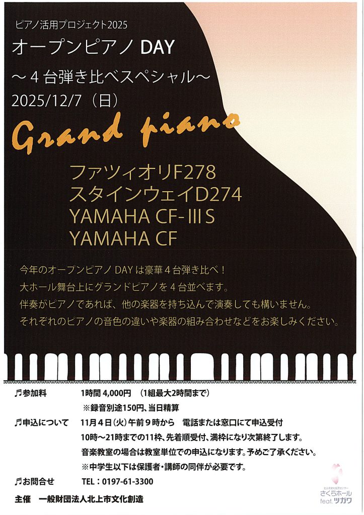 開催日 2025年12月7日(日) ピアノ活用プロジェクト2025 オープンピアノDAY 今年度はスタインウェイ・ファツィオリ・ヤマハCF-ⅢS・ヤマハCFを演奏いただけます。 |