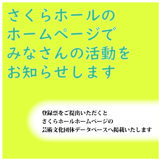 さくらホールfeat.ツガワのホームページで、みなさんの活動を紹介します。 “文化芸術団体データベース登録票”をご提出ください。 |