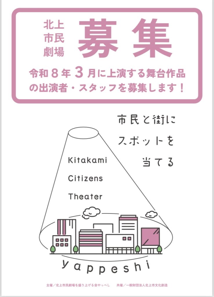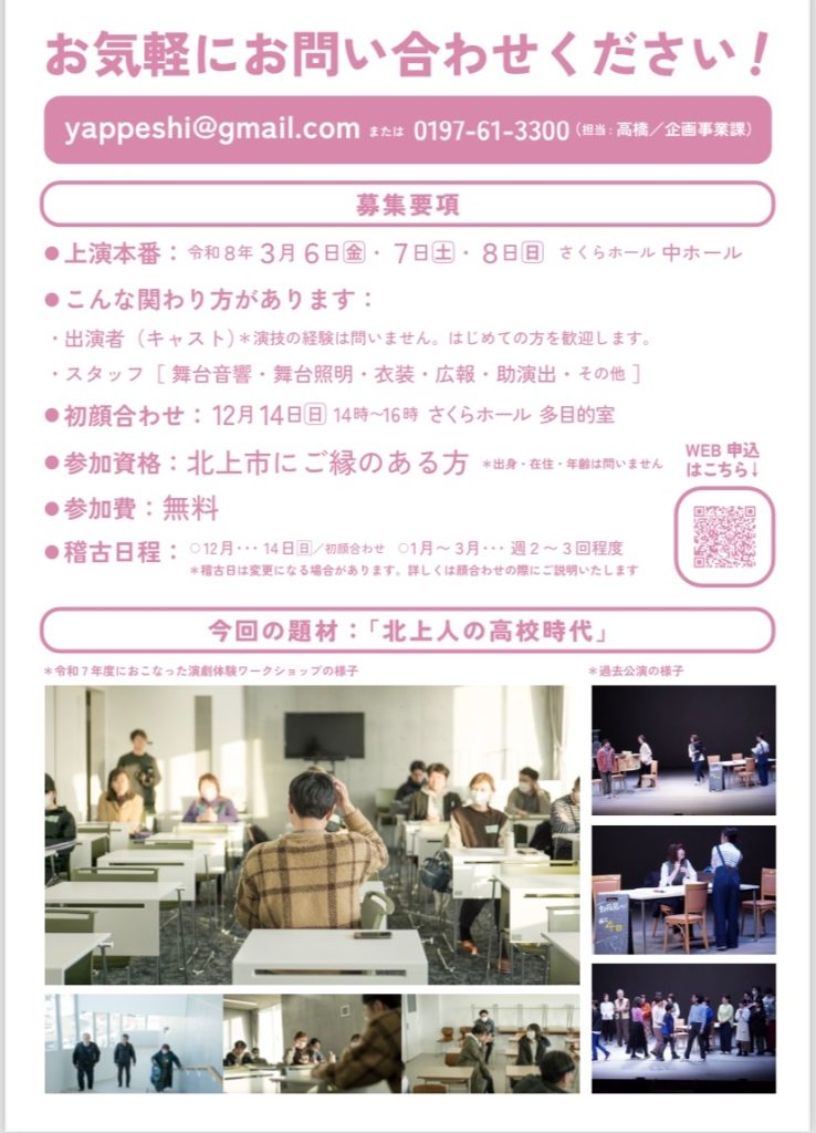 募集要項 (1)参加資格 ・高校生以上の北上市民、または北上市に縁のある方 ・両日程参加可能な方(1日のみの参加も可) ・演劇経験は不問 ・高校時代の思い出を共有したい方 ・新しい仲間との出会いに興味がある方 (2)定員:何人でも (3)参加費:無料 (4)応募締切:2026年1月11日(日)
