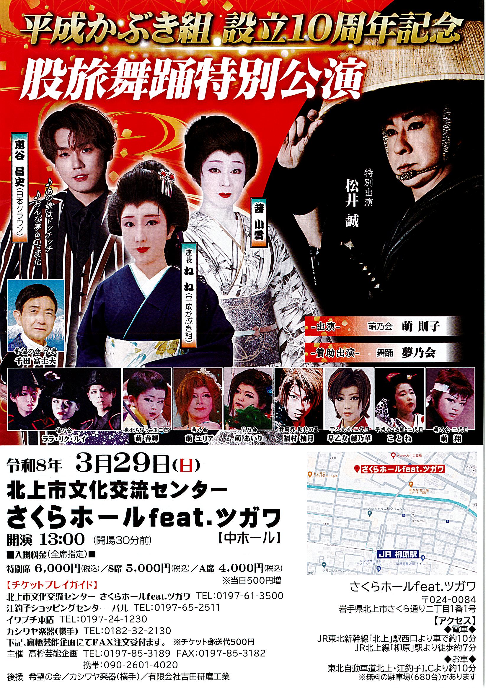 股旅舞踊特別公演開場12:30 開演13:00全席指定特別席6,000円 S席5,000円 A席4,000円 車椅子席3,000円 当日各500円増0197-85-3189・090-2601-4020 高橋芸能企画 -