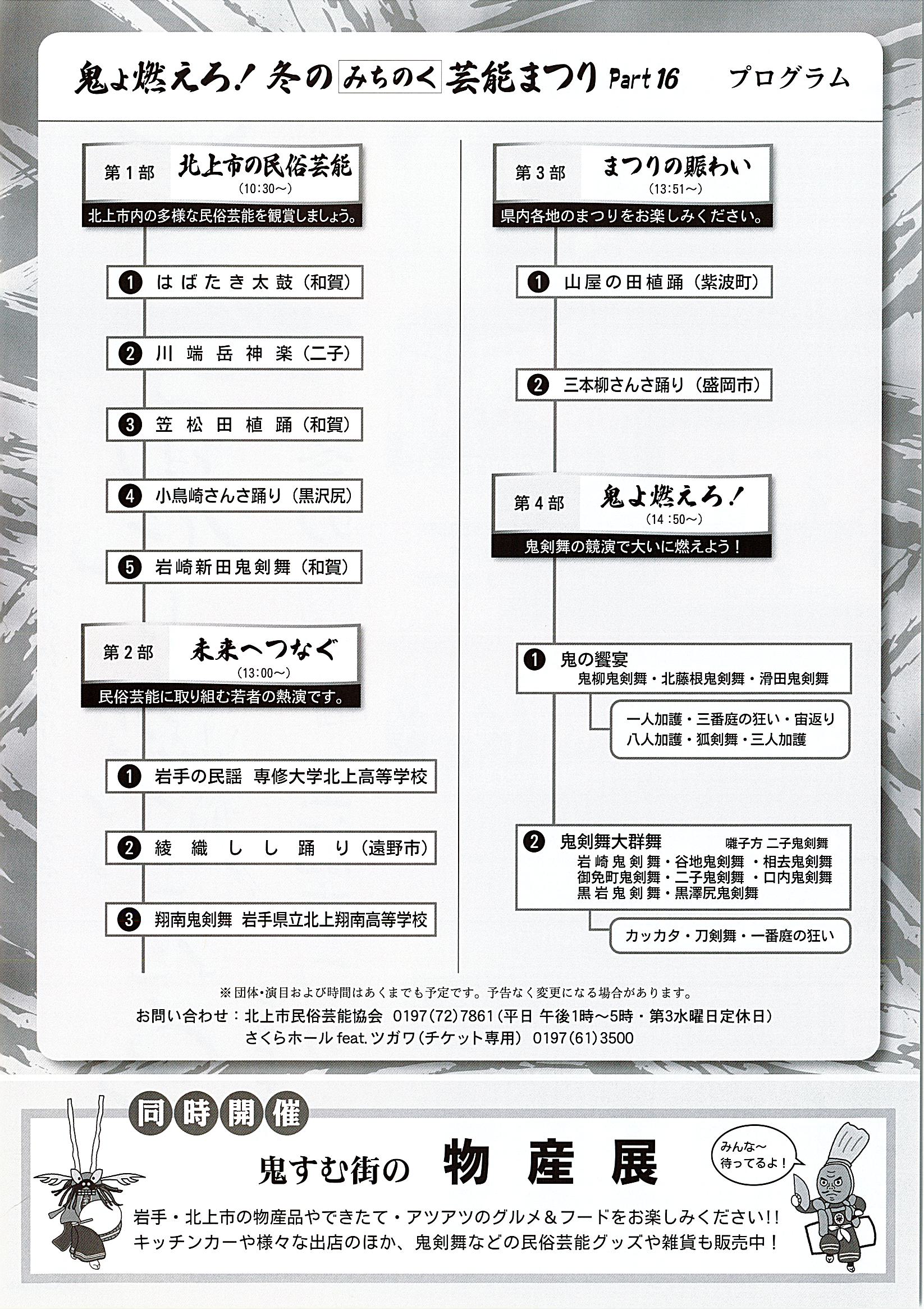 鬼よ燃えろ!冬のみちのく芸能まつりPart16開場10:00 開演10:30 終演16:00全席指定前売S席3,000円 小中学生1,500円