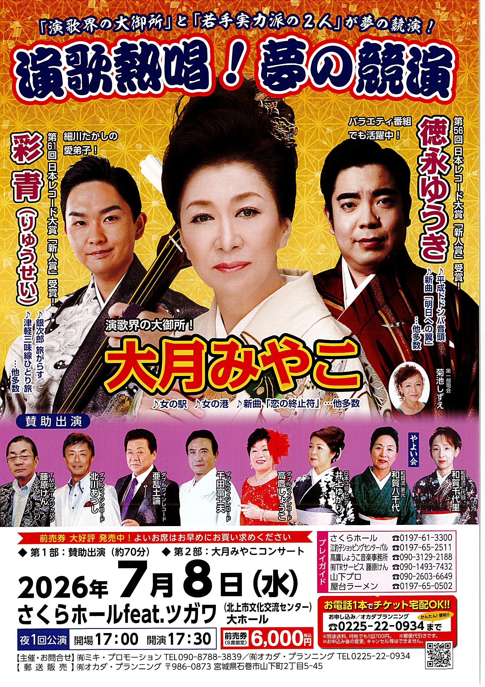 演歌熱唱!夢の競演開場17:00 開演17:30全席指定前売券6,000円※当日券は主催者にお問合せください。090-8788-3839 ミキ・プロモーション