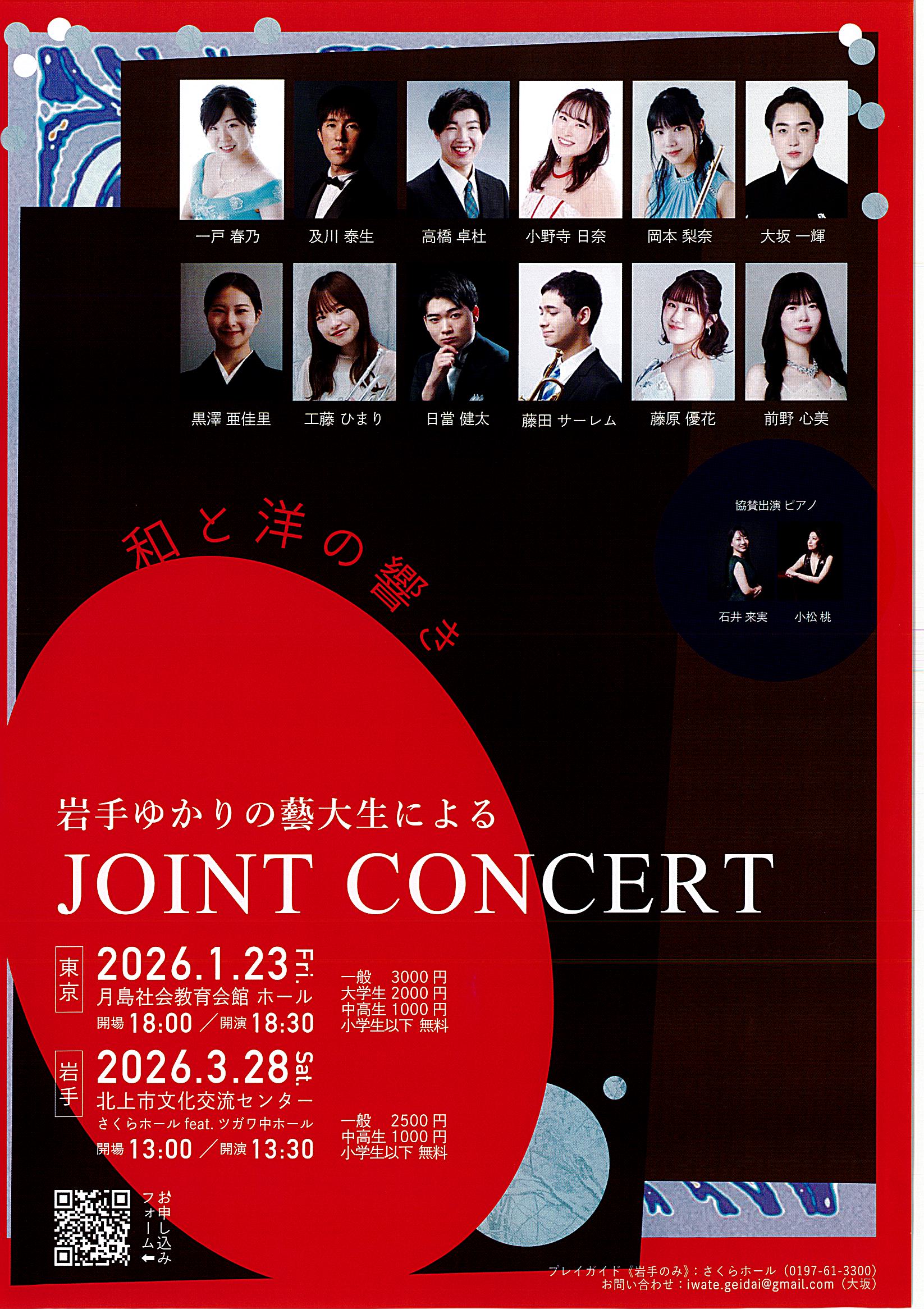 岩手ゆかりの藝大生によるJOINT CONCERT開場13:00 開演13:30全席自由一般2,500円