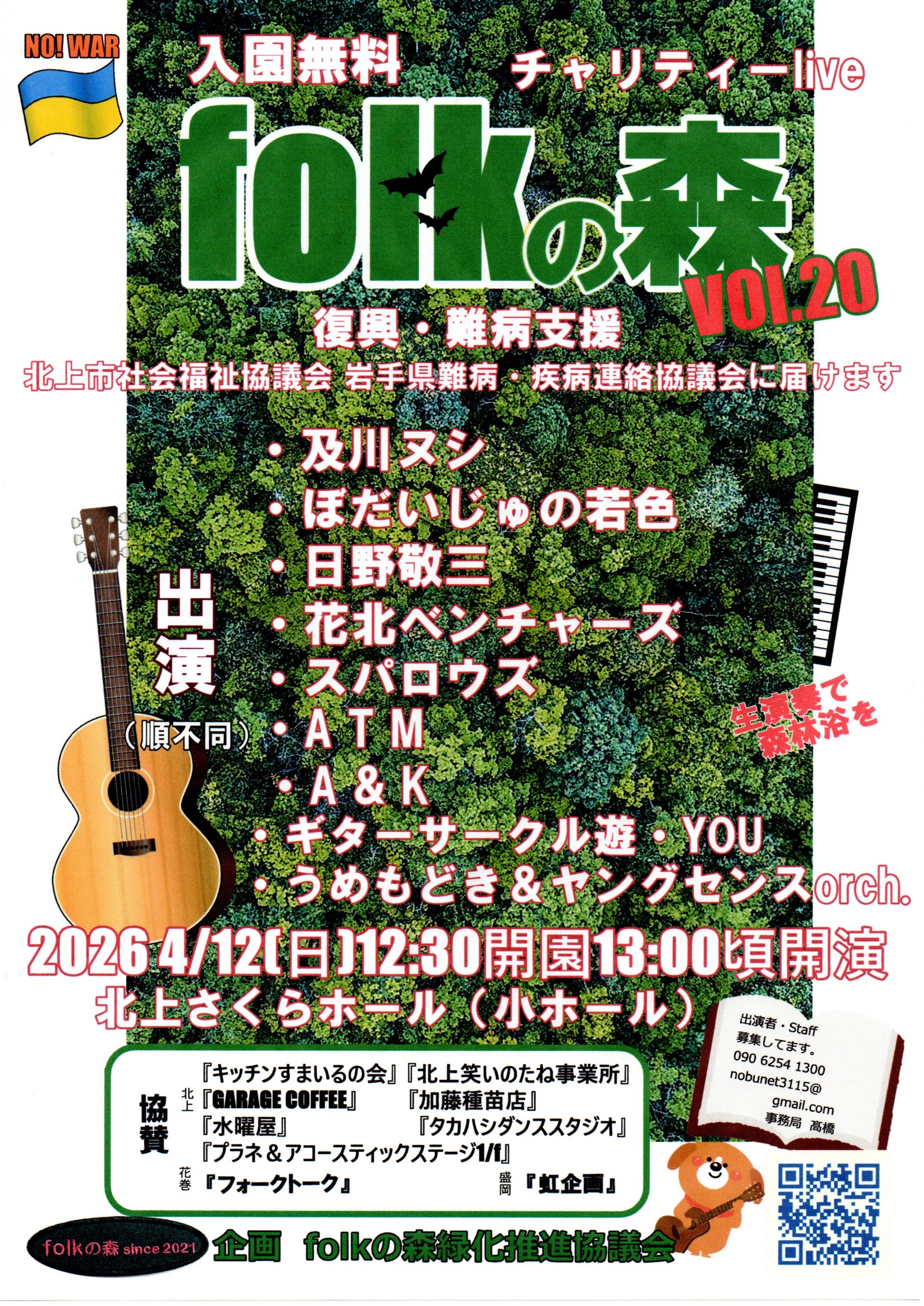 acoustic チャリティーlive folkの森 Vol.20開園12:30 開演13:00全席自由入園無料(入園券等不要)090-6254-1300 folkの森緑化推進協議会(髙橋) -
