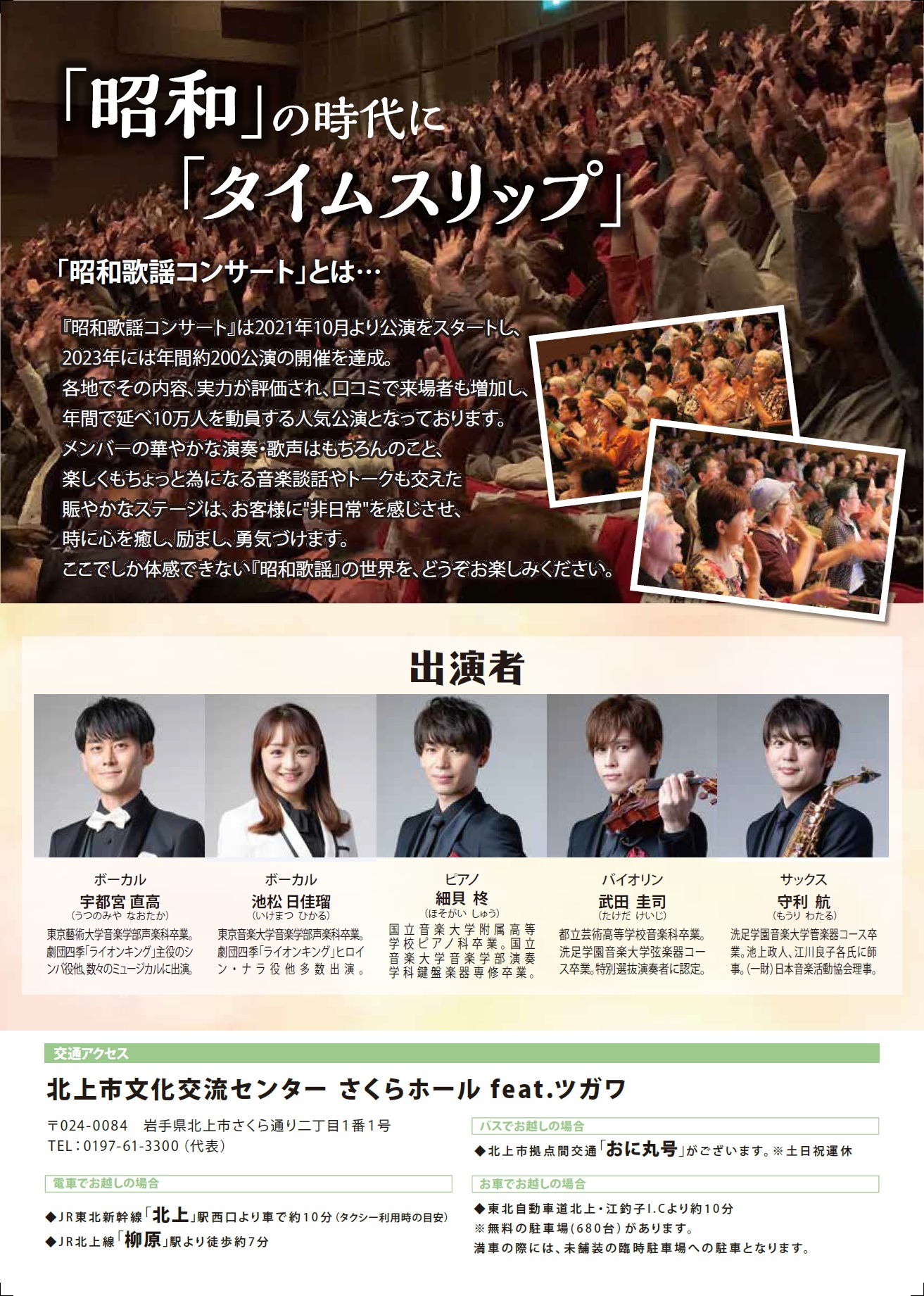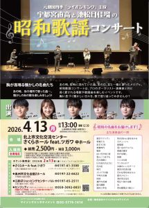 昭和歌謡コンサート開場12:30 開演13:00 終演15:00全席指定前売2,500円 当日3,000円・未就学児膝上鑑賞無料。座席が必要な場合は有料。