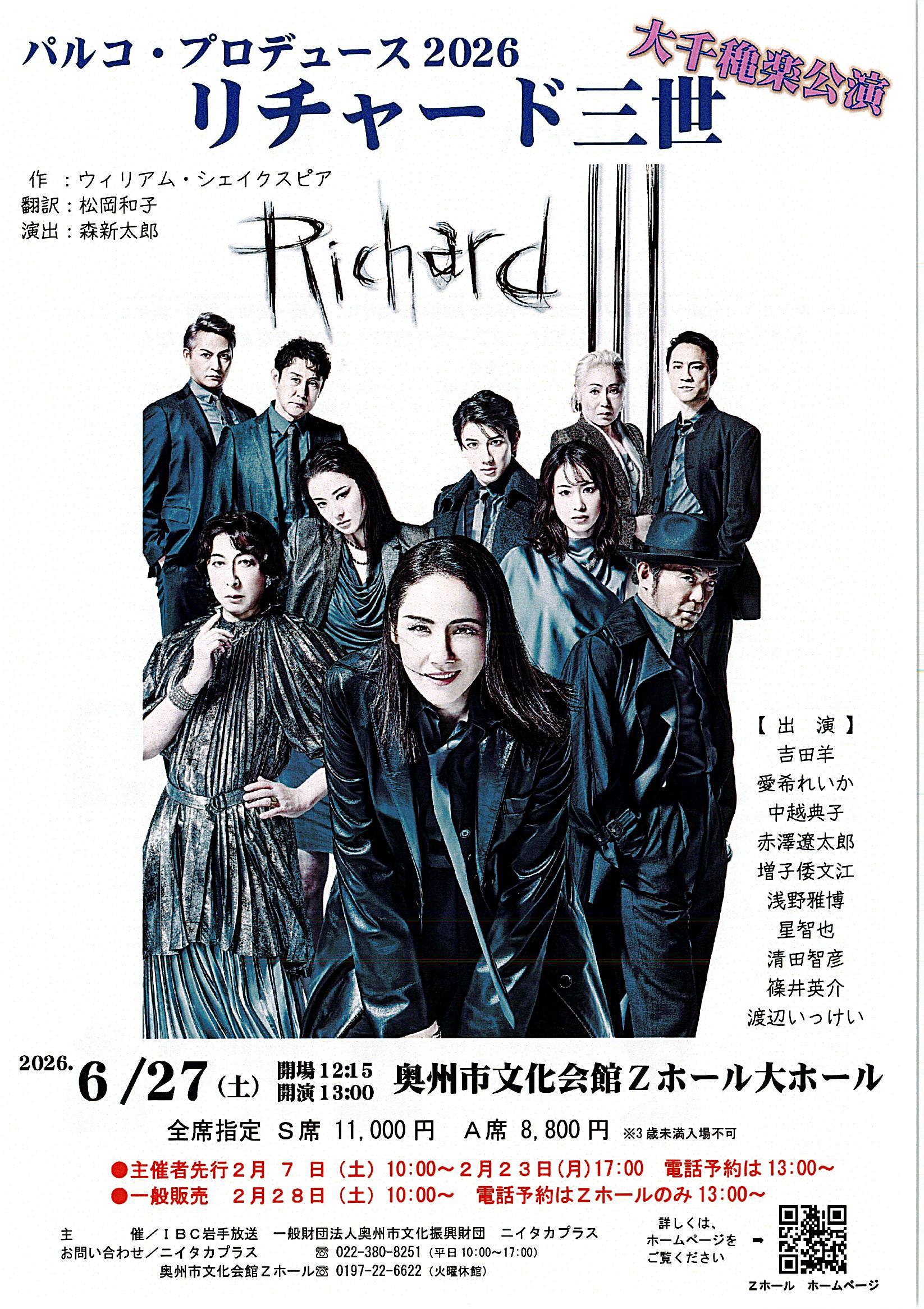 パルコ・プロデュース2026 リチャード三世開場12:15 開演13:00全席指定S席11,000円 A席8,800円さくらホール発売日(一般販売):2月28日(土)10:00~022-380-8251 ニイタカプラス(平日10:00~17:00)