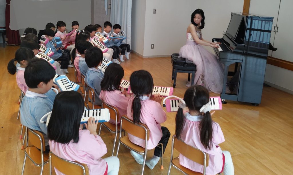 犬のぬいぐるみや唐辛子のイラストを用いながらイメージをふくらませ、美礼さんのピアノ演奏を聴きました。子どもたちは、楽しそうにリズムを取ったり、目を閉じて静かに聴き入ったり、ピアノの周りに集まって間近で演奏を味わったりと、さまざまなかたちでピアノの豊かな響きを楽しんでいました。また、日頃の活動で親しんでいる鍵盤ハーモニカで「きらきら星」を演奏し、美礼さんのピアノと共演しました。「上手に吹けたね。」と声をかけてもらい、ニコニコ笑顔の子どもたちでした。